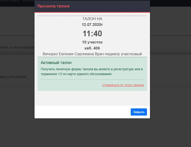 Обращаем Ваше внимание, что если у пациента отложен талон к врачу-специалисту, то отложить еще один талон к врачу-специалисту данного профиля НЕВОЗМОЖНО!