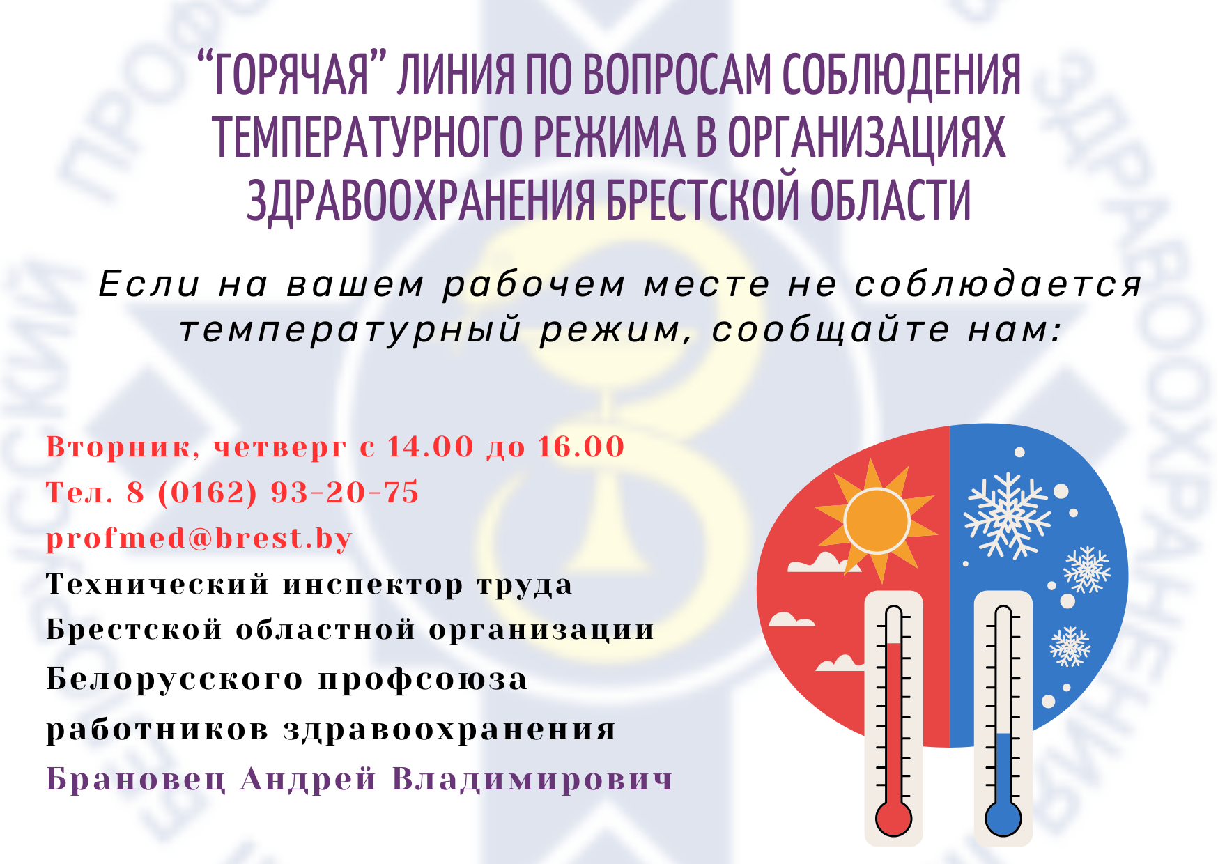 Брановец Андрей Владимирович, тел. 8 (0162) 93 20 75 (по вторникам и четвергам с 14.00 до 16.00 – «горячая линия» по вопросам соблюдения температурного режима на рабочих местах в организациях здравоохранения области);